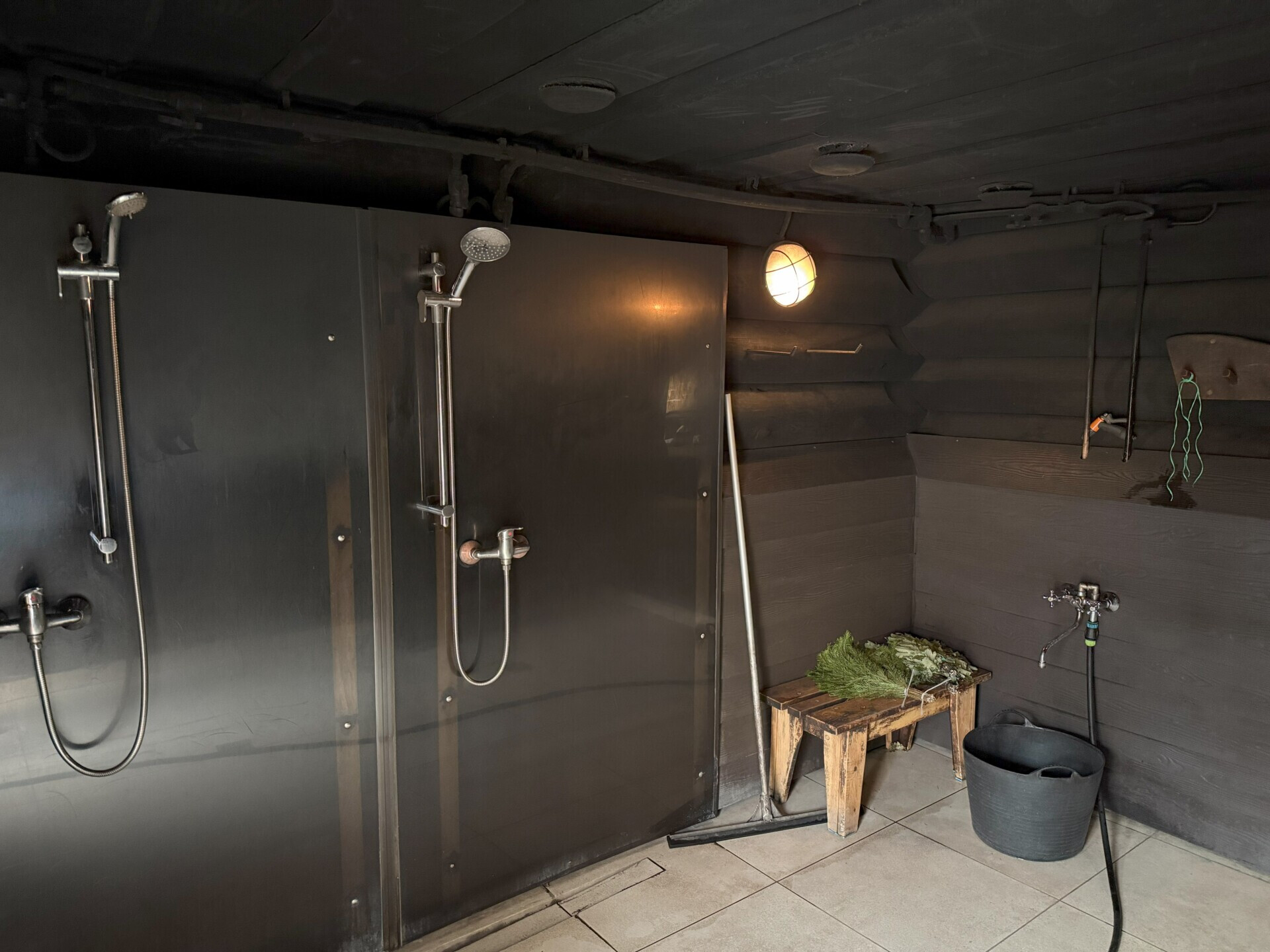 В самой бане по-черному есть зона отдыха со столом и скамейками, можно спокойно посидеть, попить чаю. Есть мыльная зона с душевыми кабинками и местом для подготовки веников. Ну и, собственно, сама парная.