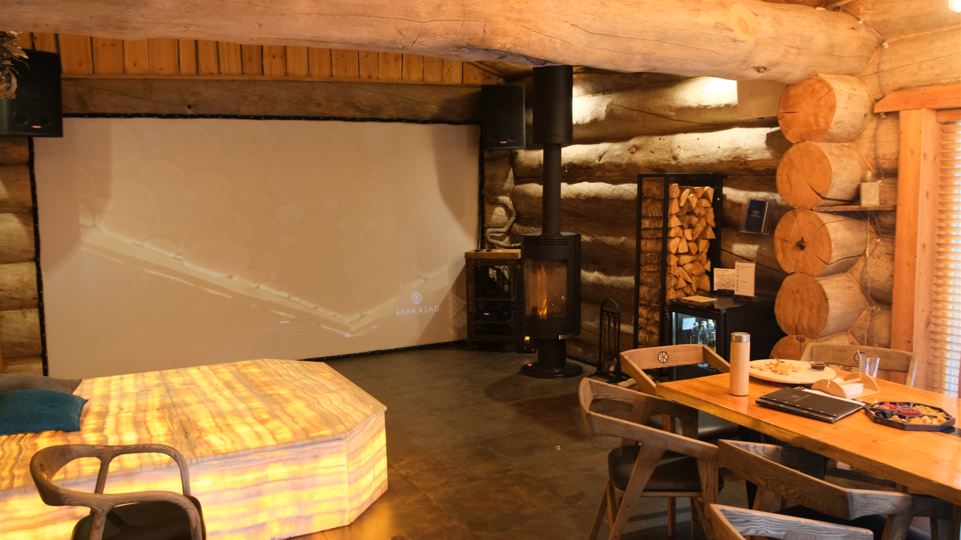 В основной зоне отдыха есть мраморный лежак-кровать. На нем можно полежать, погреться, и после парения это реально прикольная тема — просто подкисать и восстанавливаться. Также есть проектор на большую стену, что тоже можно записать в плюс.