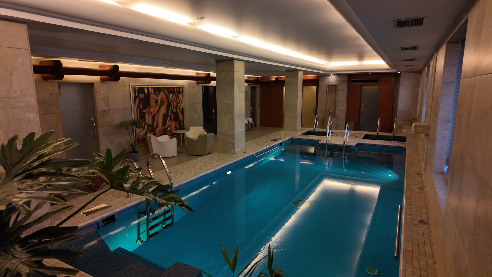После душевой попадаем в большую мыльную зону. Здесь находится большой бассейн, в котором уже можно нормально поплавать, а не просто окунуться для галочки.