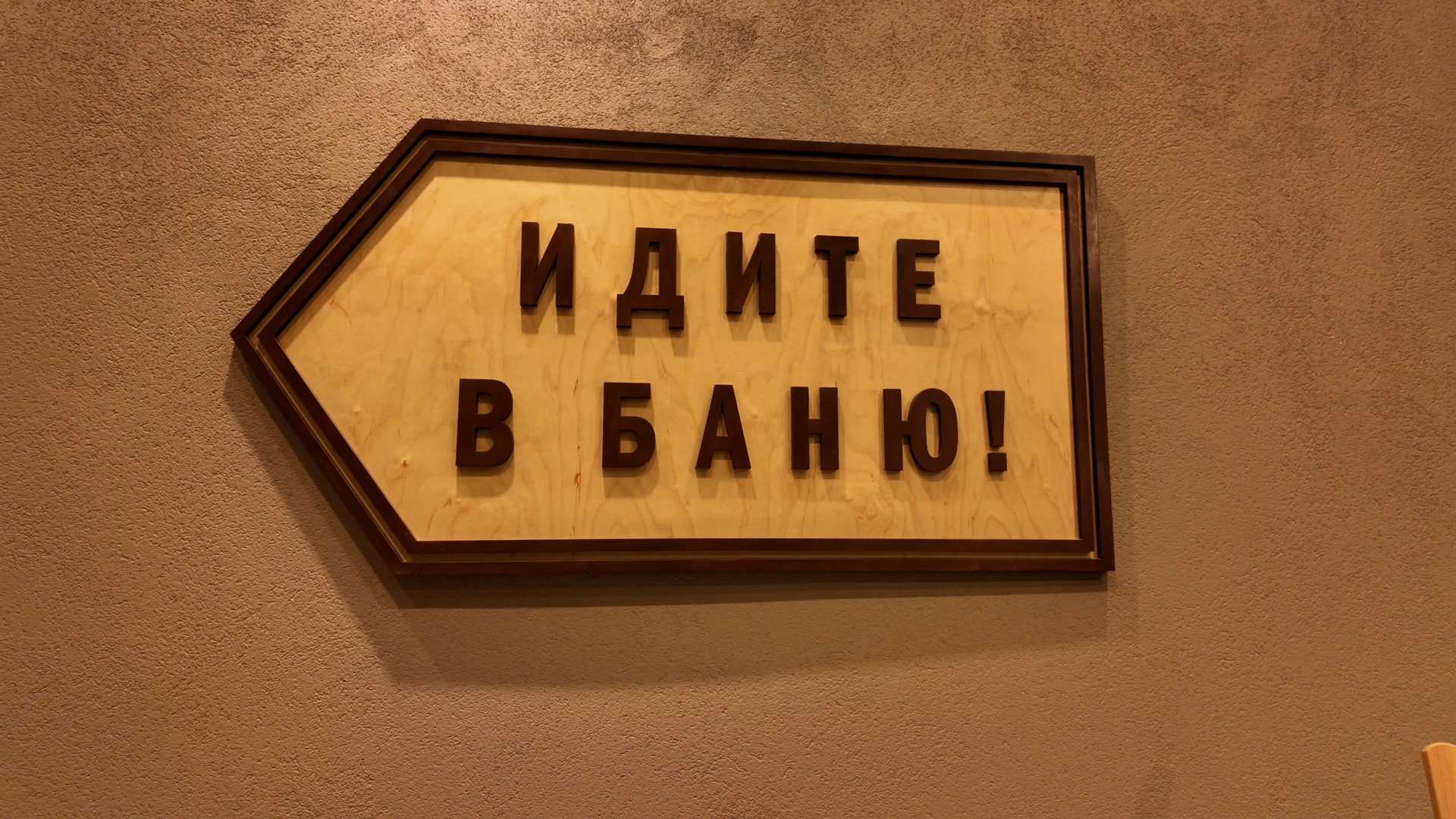 При входе нас встречает небольшая зона кафе-ресторана, дальше гардероб. И, наверное, уже можно считать это своеобразным слоганом Дегтярных бань: прямо на лестнице стрелочка с надписью «Идите в баню». В их случае звучит это даже гостеприимно.