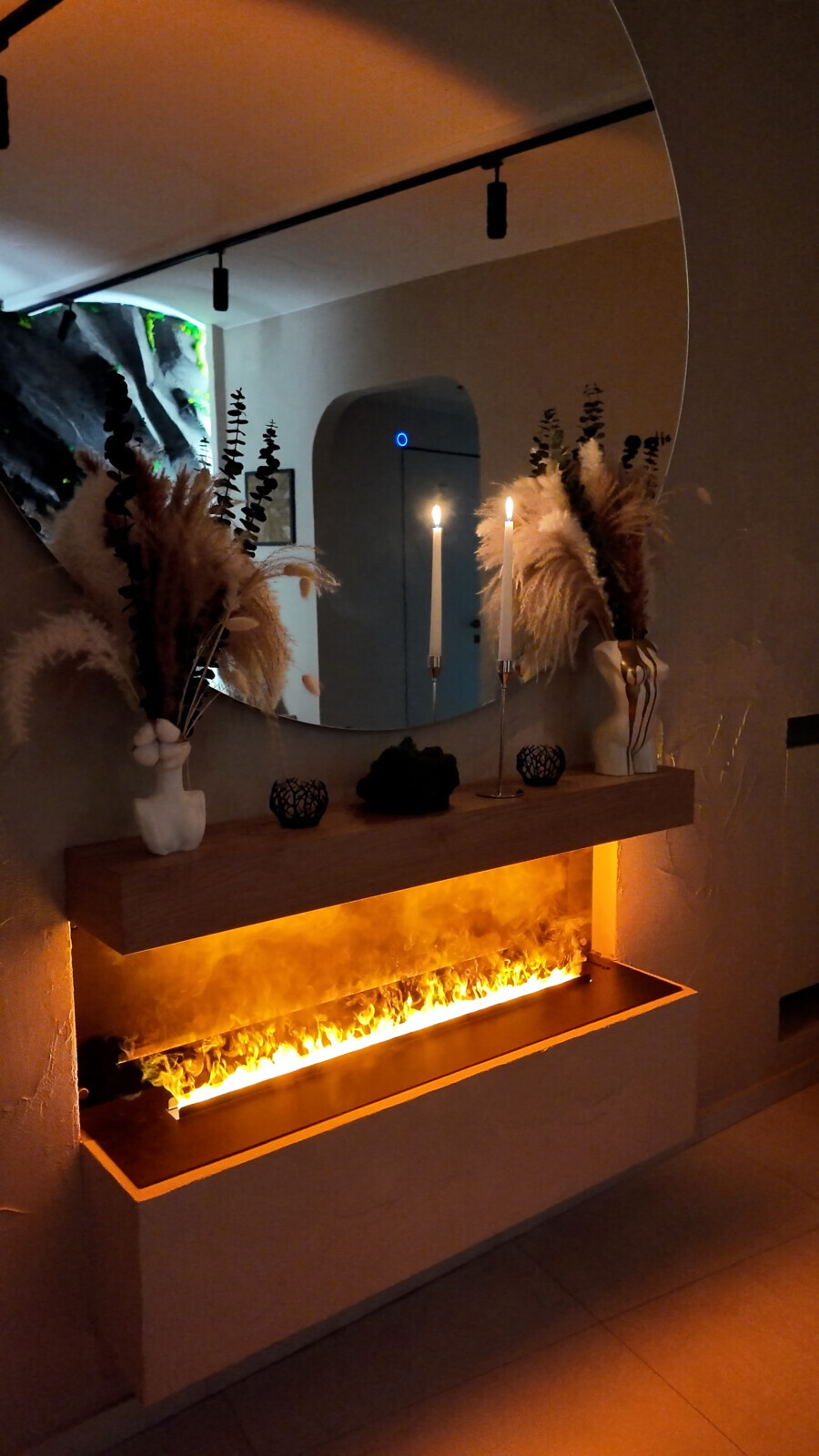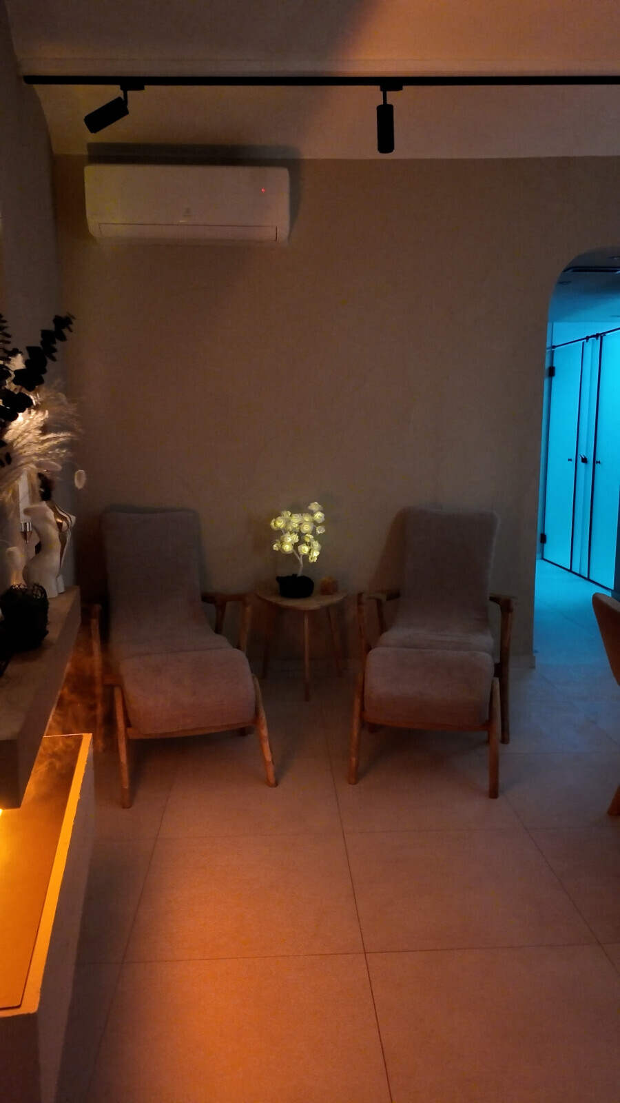 Дальше попадаешь в основную зону отдыха. Здесь приглушенный свет, есть кондиционер, лежаки для отдыха, стол, декоративные стены и электрокамин. Всё смотрится достаточно цельно и уютно, без лишнего перегруза.