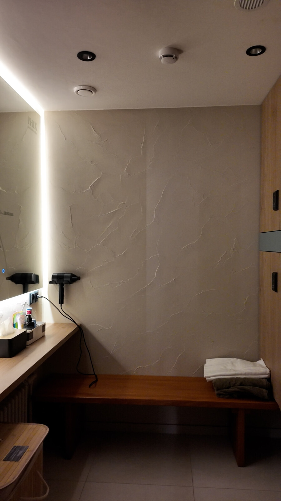 Рядом есть раздевалка, и в целом всё нужное для гостей предусмотрено. Для каждого гостя идет индивидуальный банный комплект, есть фен и прочие мелочи, которые обычно нужны в таких местах.