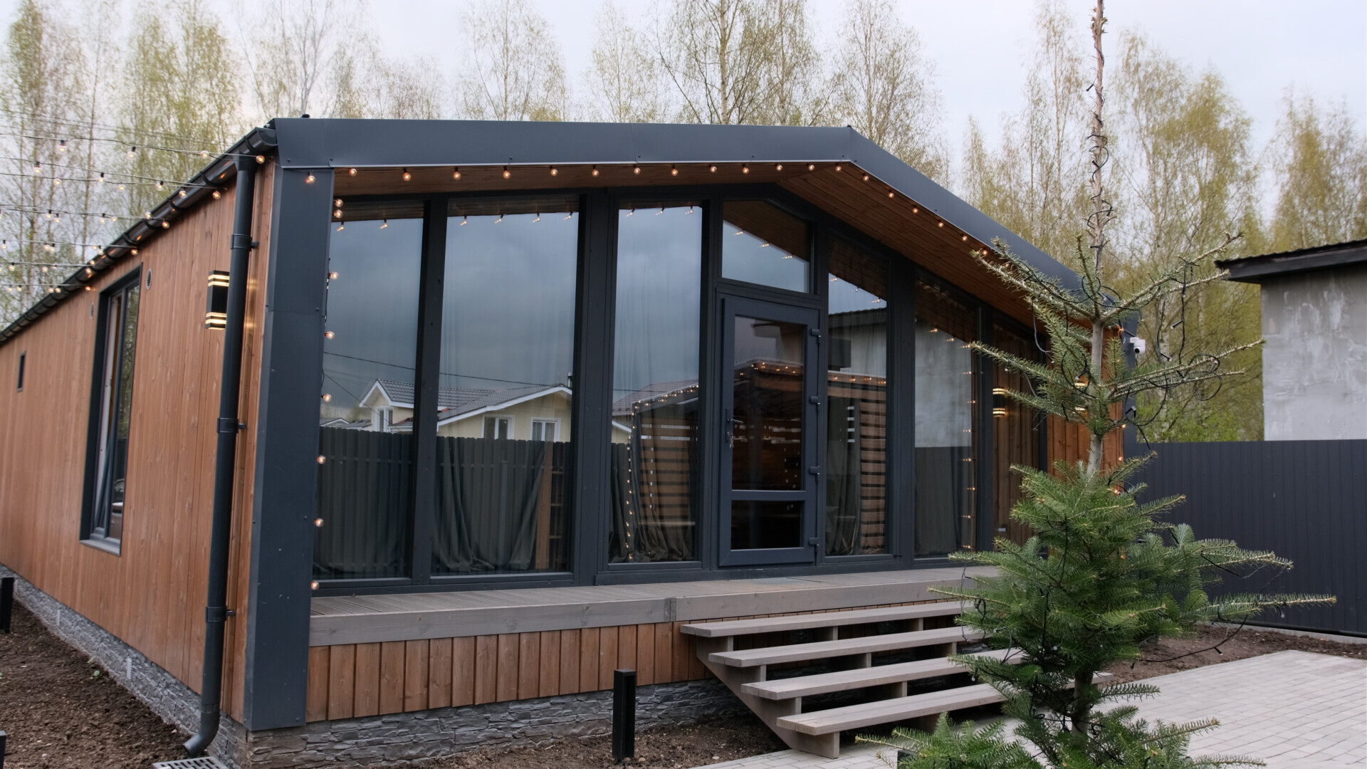 Сама парная просторная, полки удобные. Двоих одновременно парить там вообще не проблема. Также есть остекление — видно часть террасы и улицу, что тоже добавляет атмосферы.