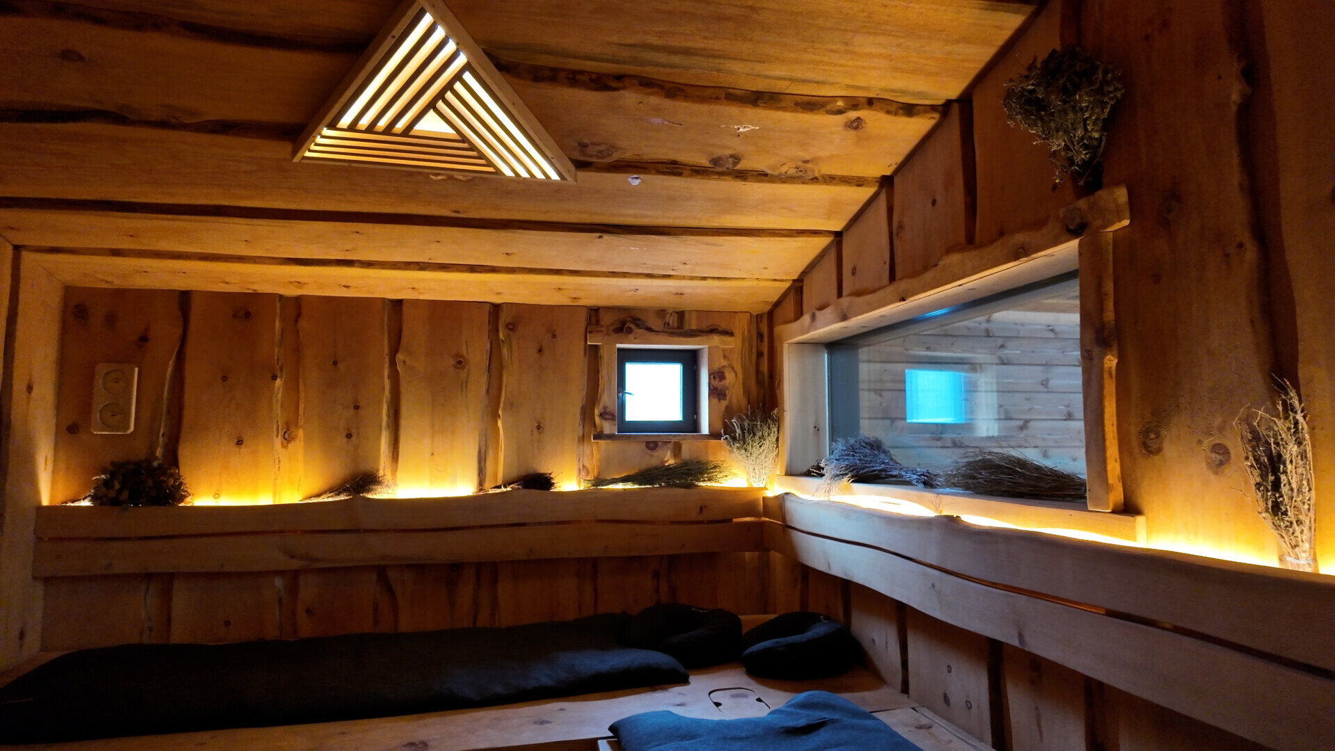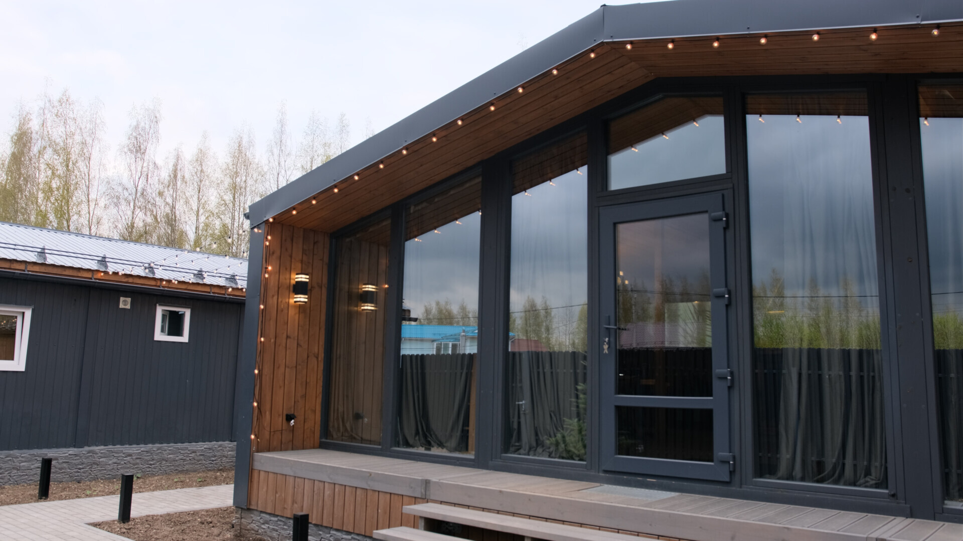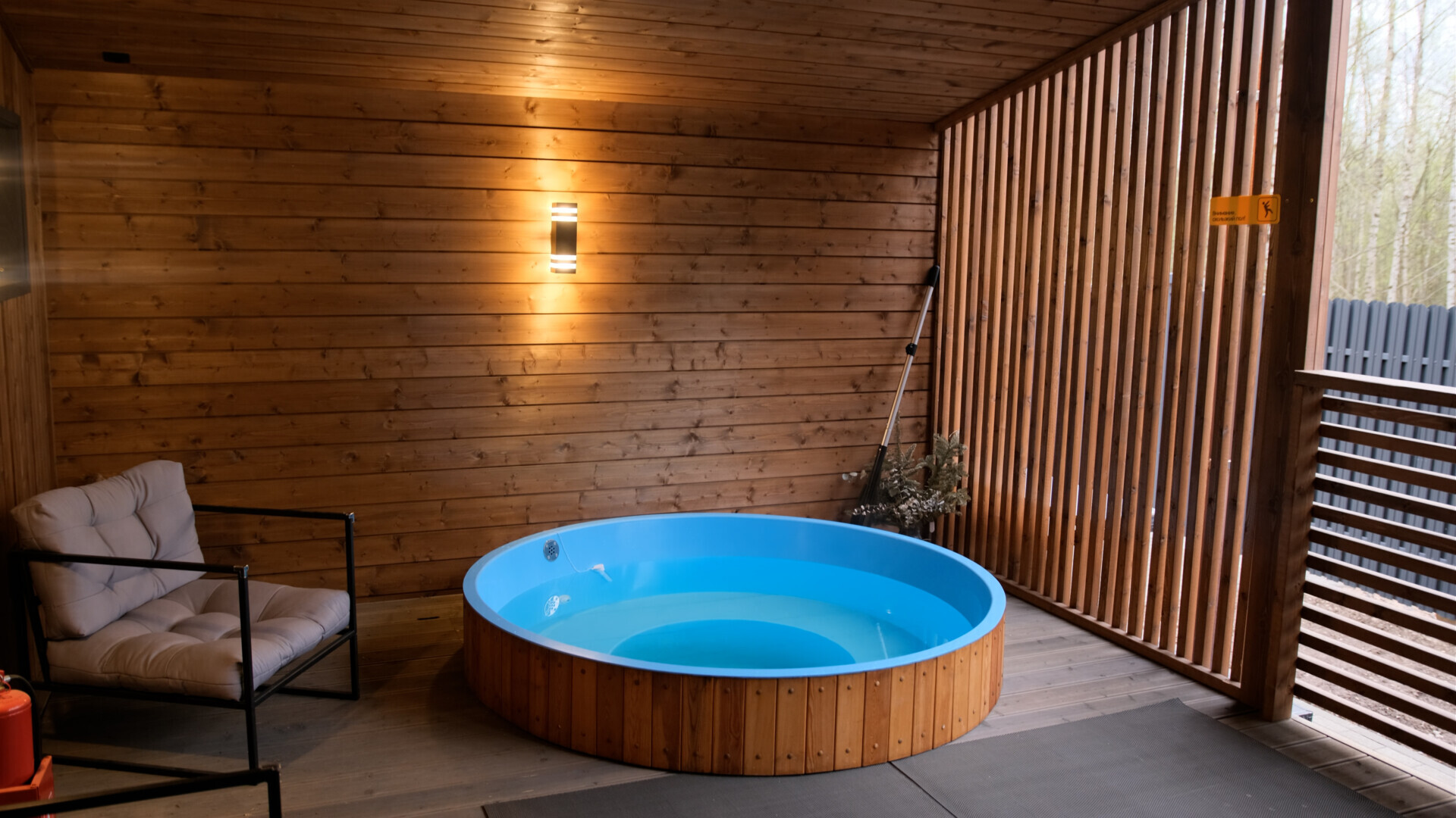 По сути, это полноценный отдельный дом с просторной зоной отдыха, раздевалкой, мыльной зоной, парной и террасой. На террасе находятся ледяная купель, теплая купель и сеновал с качелью. Плюс есть небольшая дворовая территория, по которой можно пройтись, подышать свежим воздухом. Она не огромная, но этого вполне достаточно, чтобы после процедур немного выдохнуть и переключиться.