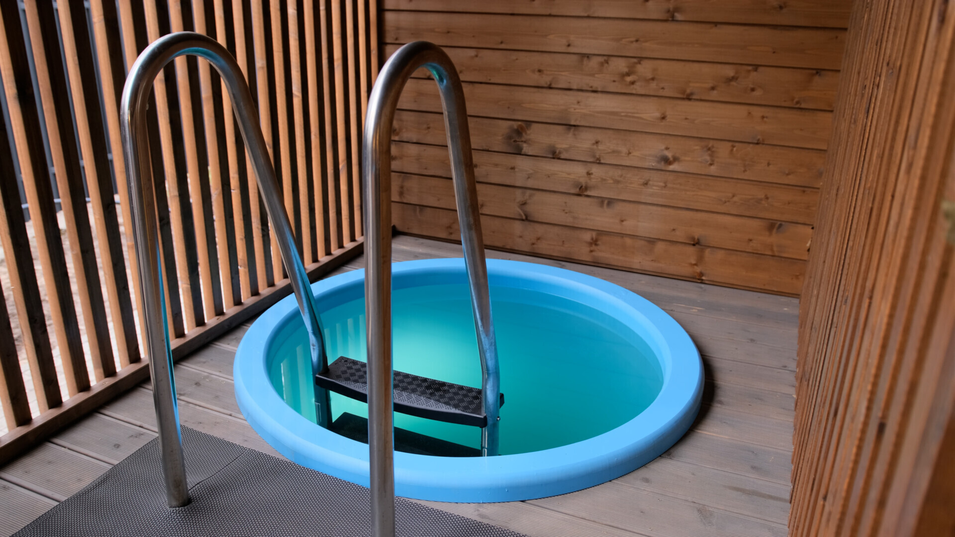 Зона террасы здесь тоже удачная. Ледяная купель прям хорошая, комфортной температуры. Есть теплый чан, где можно посидеть, особенно если это зимнее время.