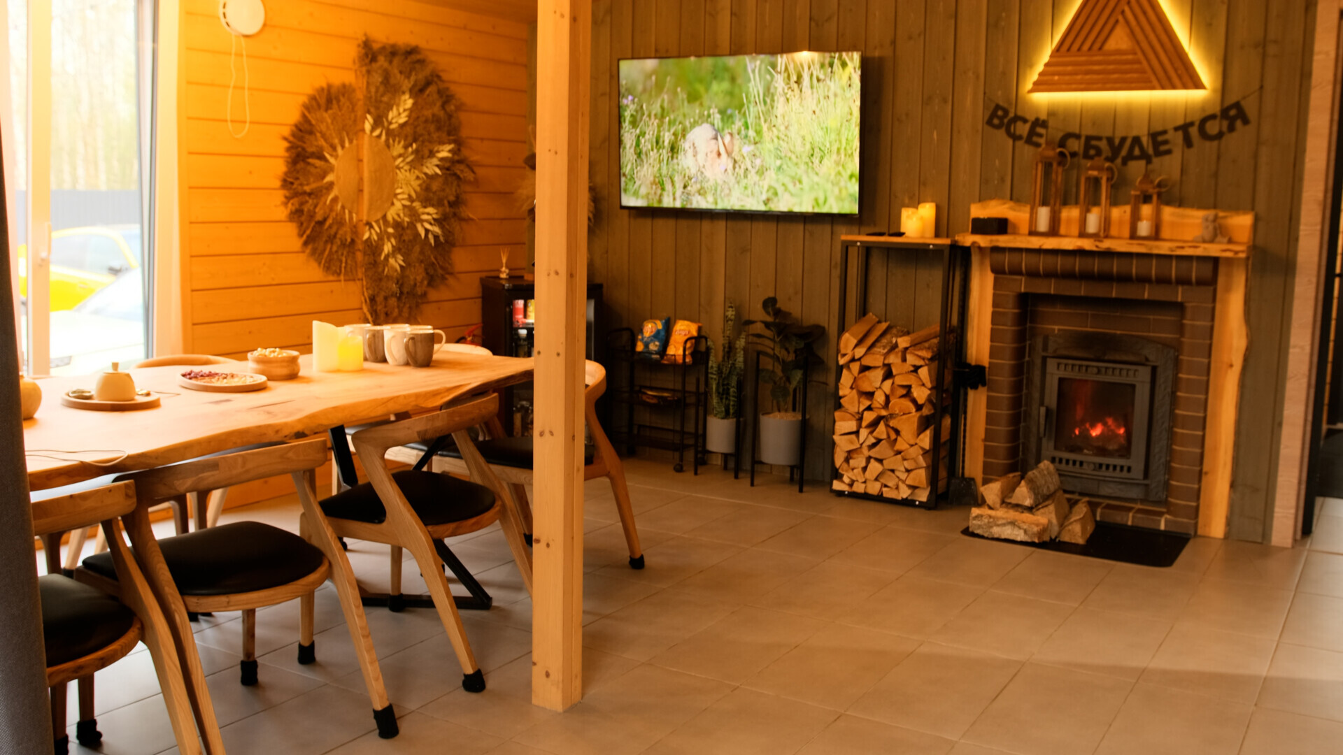 Теперь подробнее. В основной зоне отдыха, когда я там был, прям чувствовалась новизна. Всё чистое, аккуратное, мебель новая, приятная. Стоит большой стол, есть панорамное остекление. В эту же зону выходит топка печи, и за счет этого создается такой более уютный, почти каминный эффект.