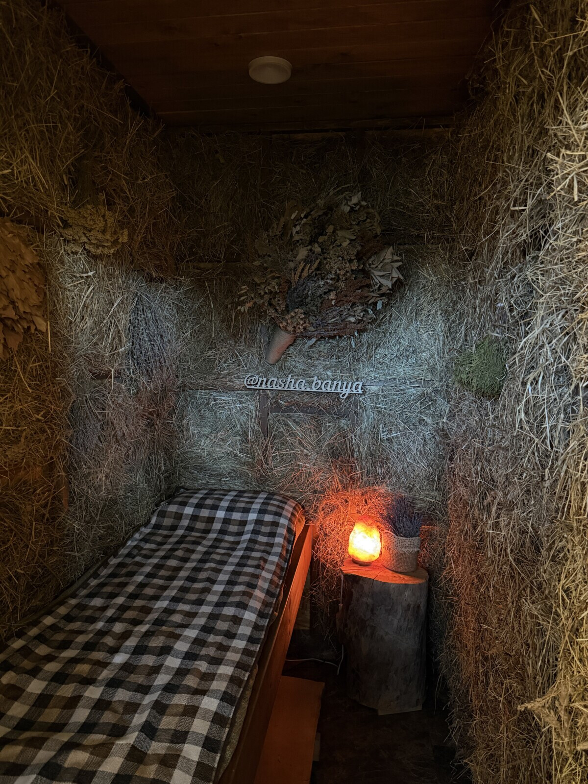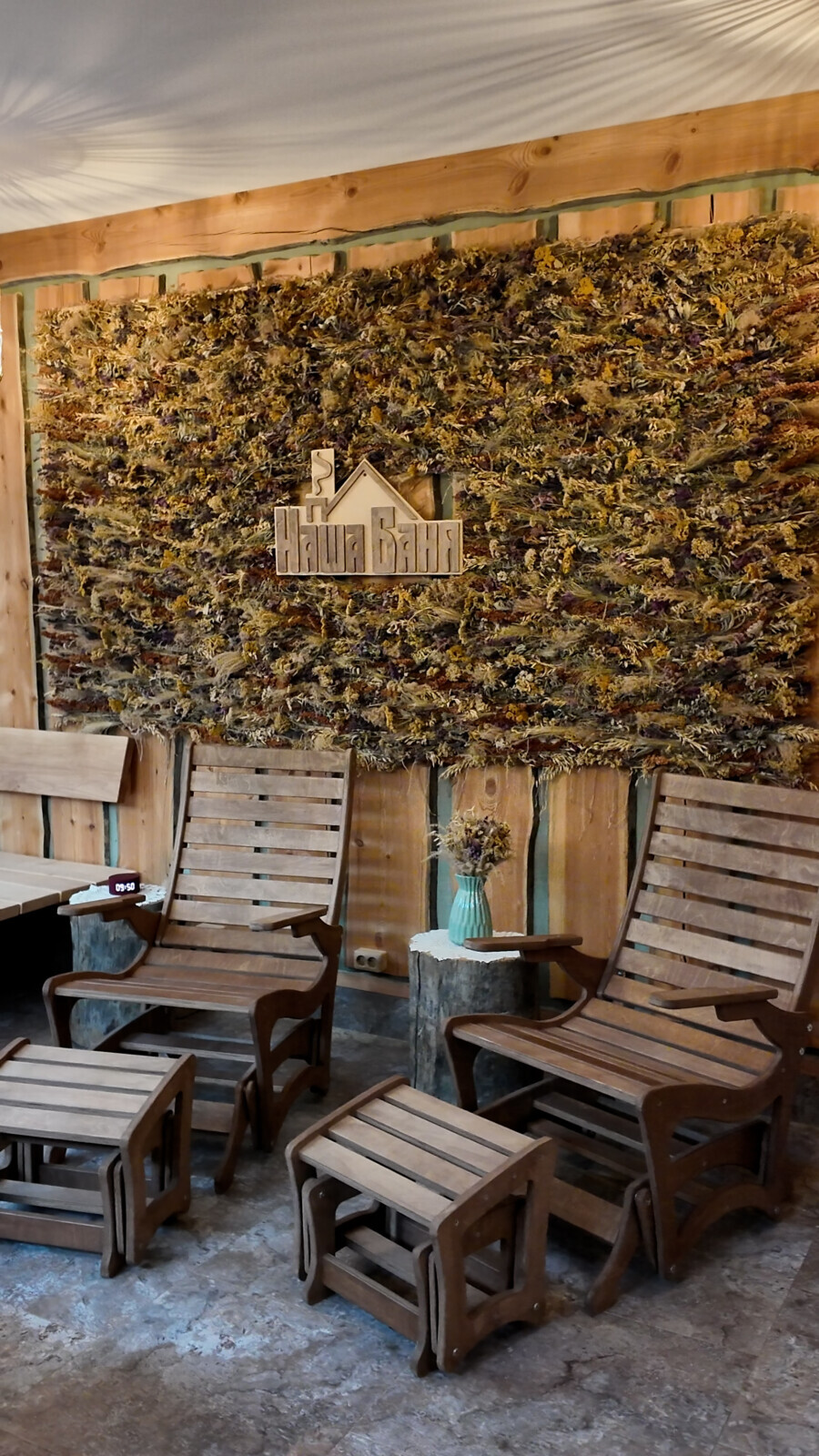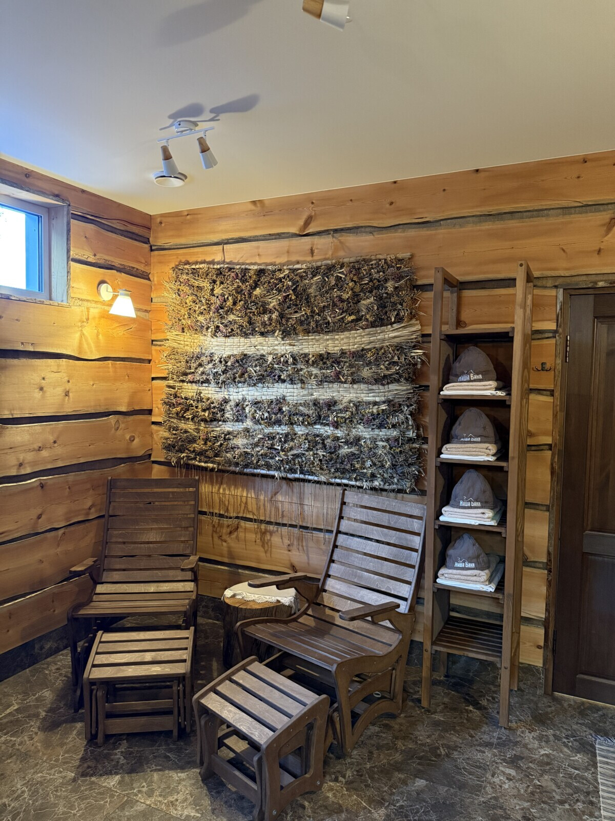 Пространство выглядит уютно и спокойно. Рядом же расположен небольшой сеновал, увешанный вениками. После процедур туда можно зайти, полежать, подышать ароматом трав и просто немного восстановиться.