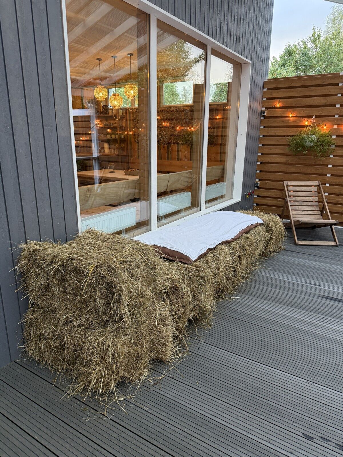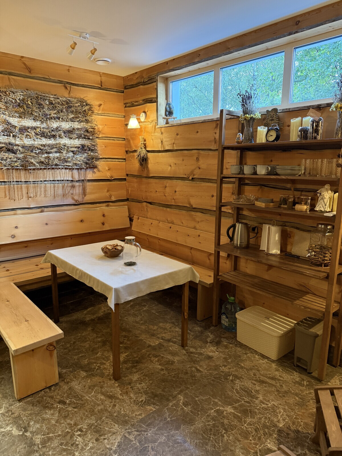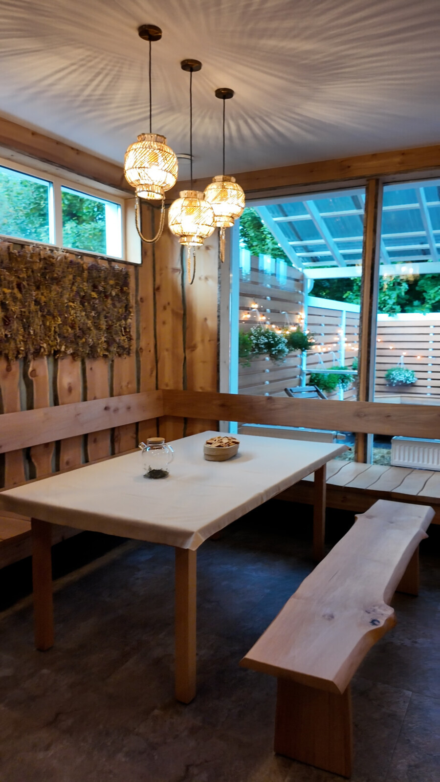 Пространство выглядит уютно и спокойно. Рядом же расположен небольшой сеновал, увешанный вениками. После процедур туда можно зайти, полежать, подышать ароматом трав и просто немного восстановиться.