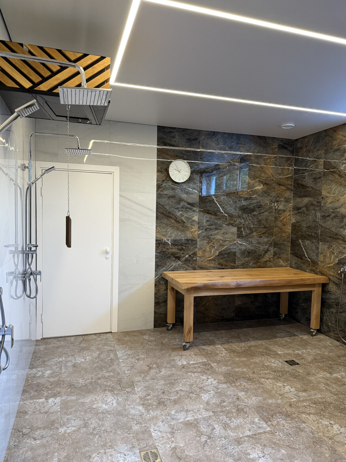 С улицы можно попасть и в зону массажного кабинета. То есть баня здесь строится не только вокруг парной, но и вокруг более комплексного формата отдыха и восстановления.
