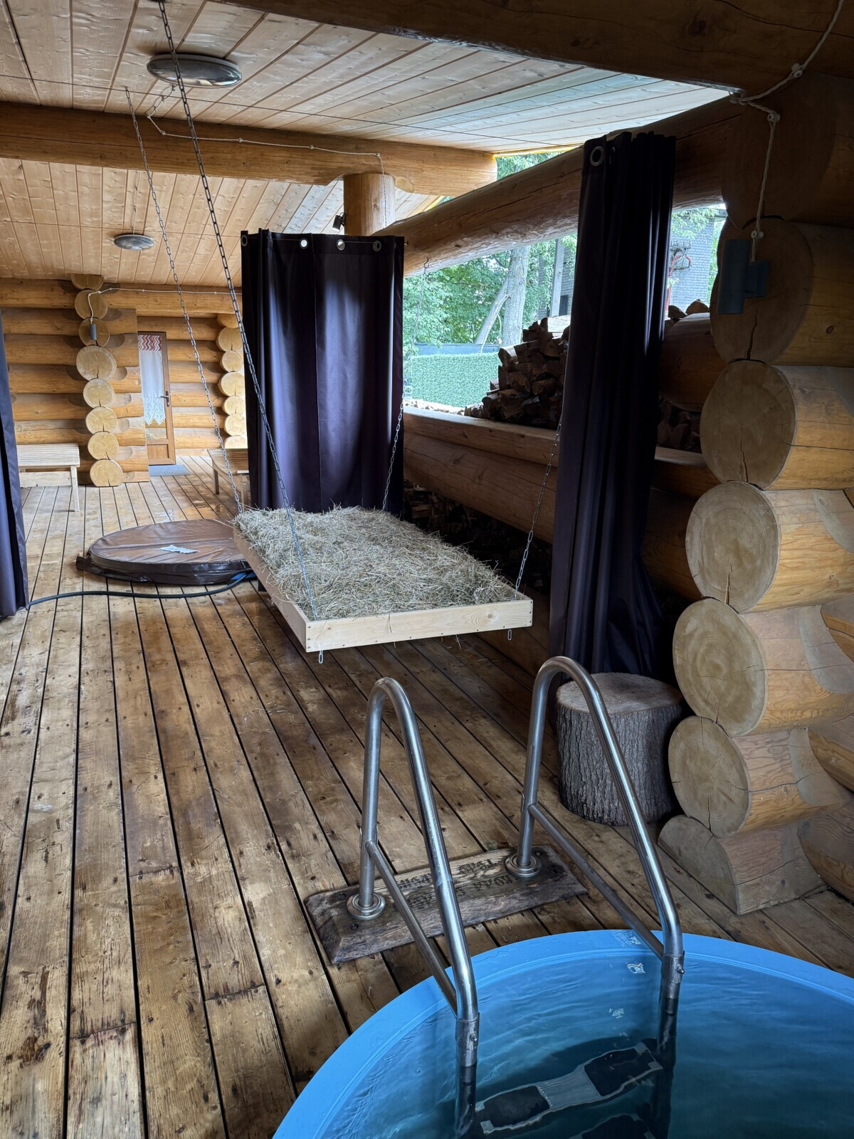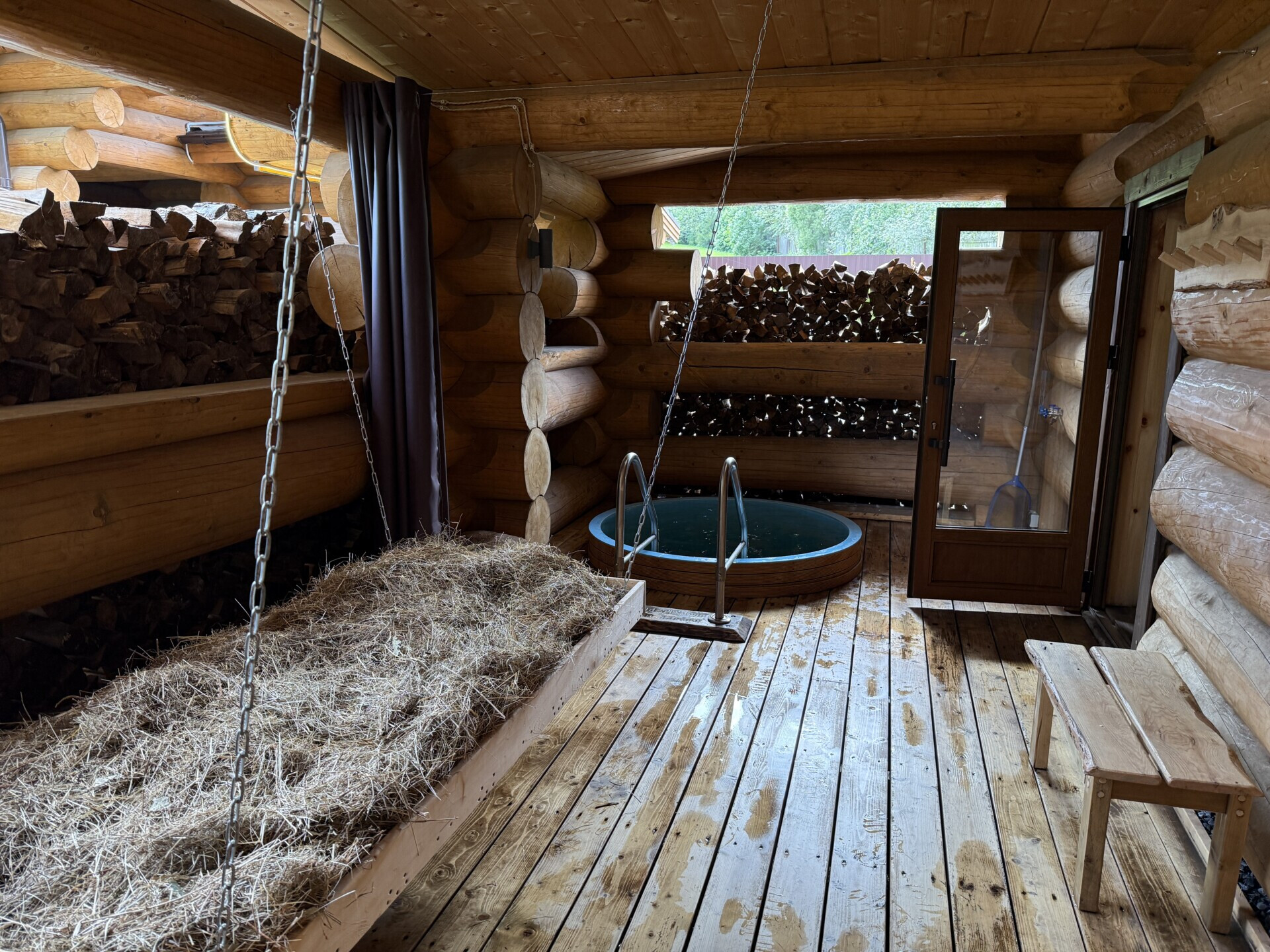 Терраса здесь классическая для сети «Пар для гурманов»: сеновал, лежаки, холодная купель.