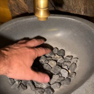 Очень понравились светильники, оформление, раковина — она сделана прям необычно. Камушки в раковине тоже смотрятся круто. Вроде мелочь, но именно такие вещи и собирают общее впечатление.