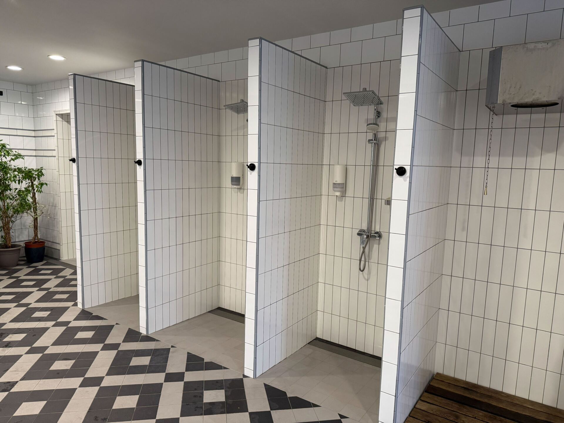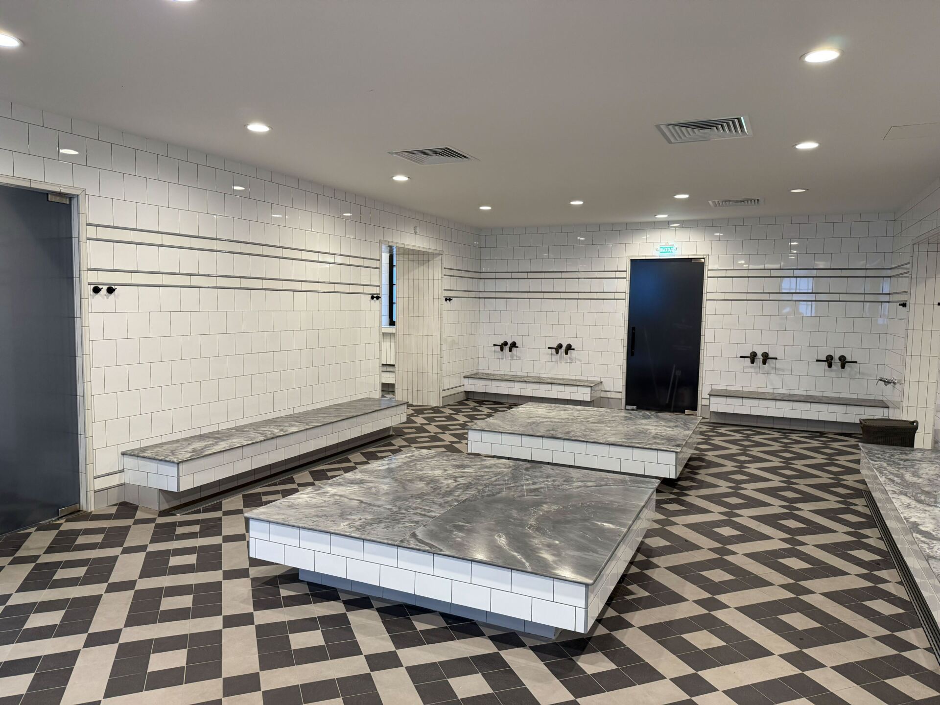 Сама мыльная зона просторная. Есть душевые, лежаки, обливные устройства — все, что нужно для нормального банного процесса.