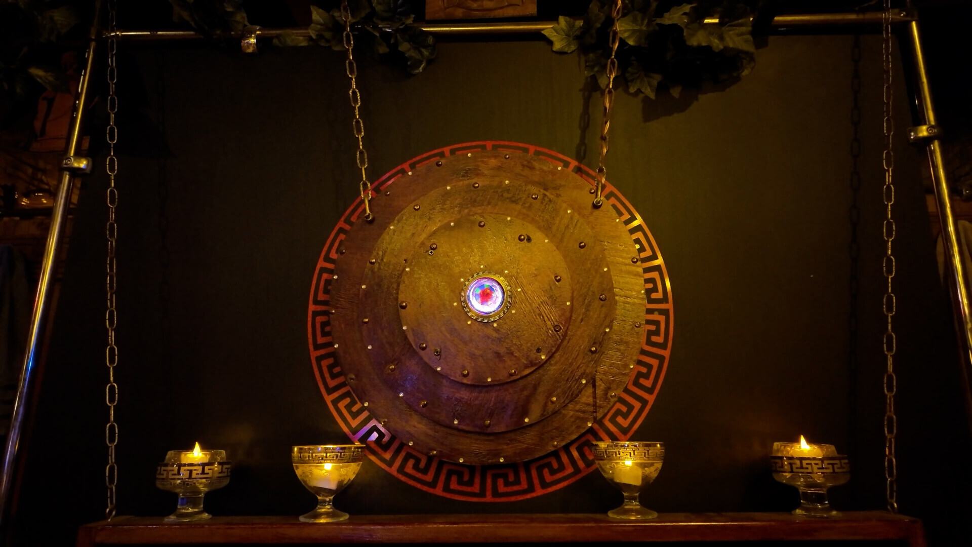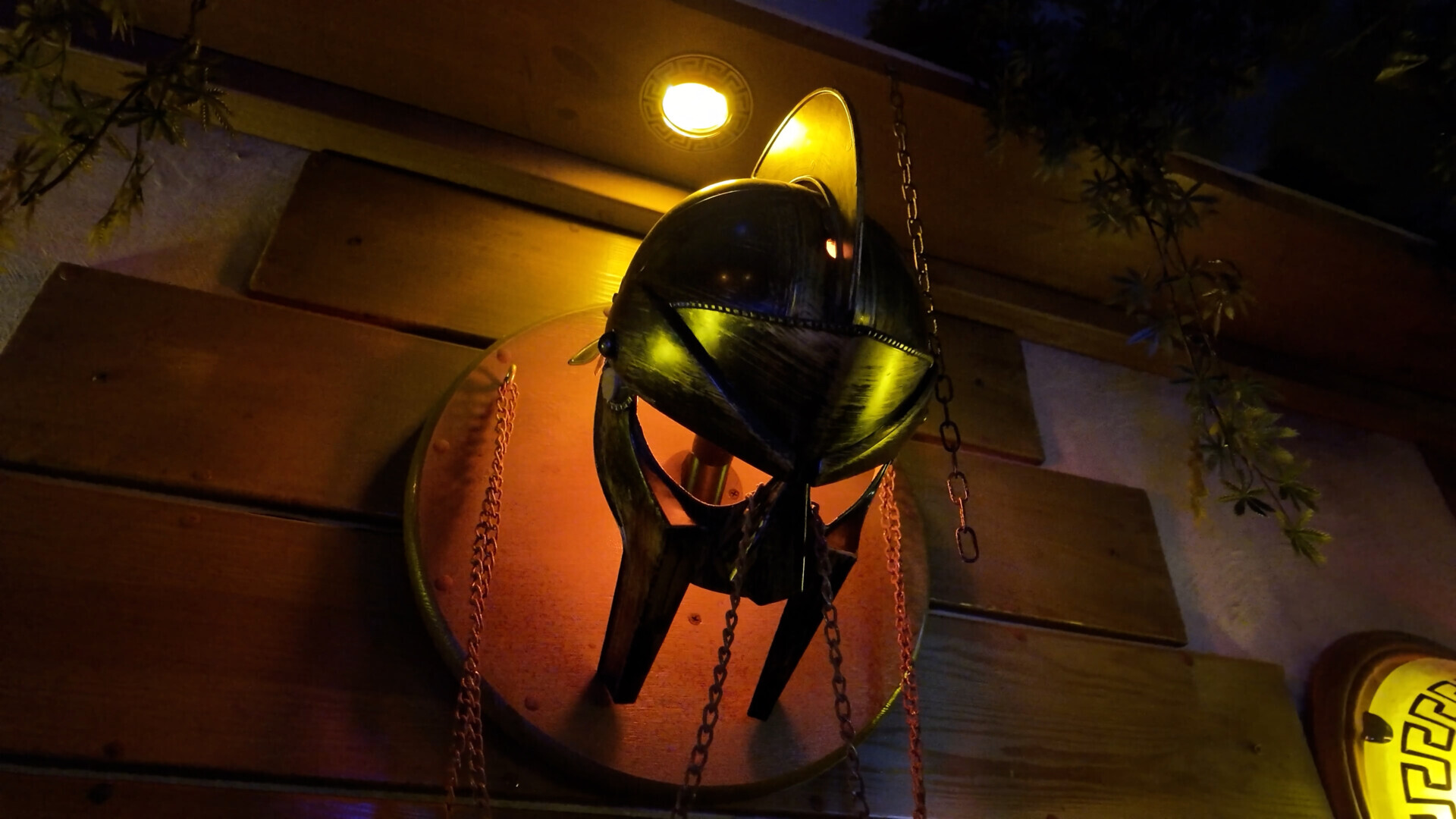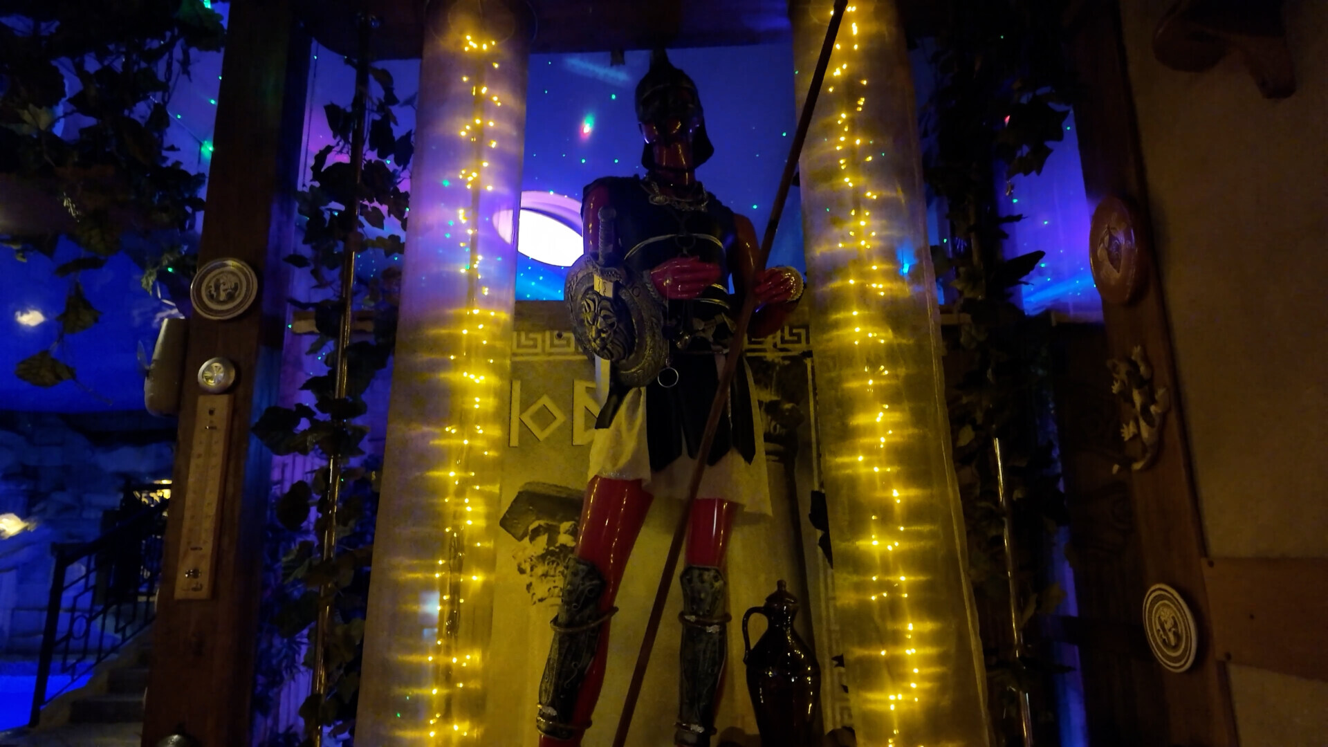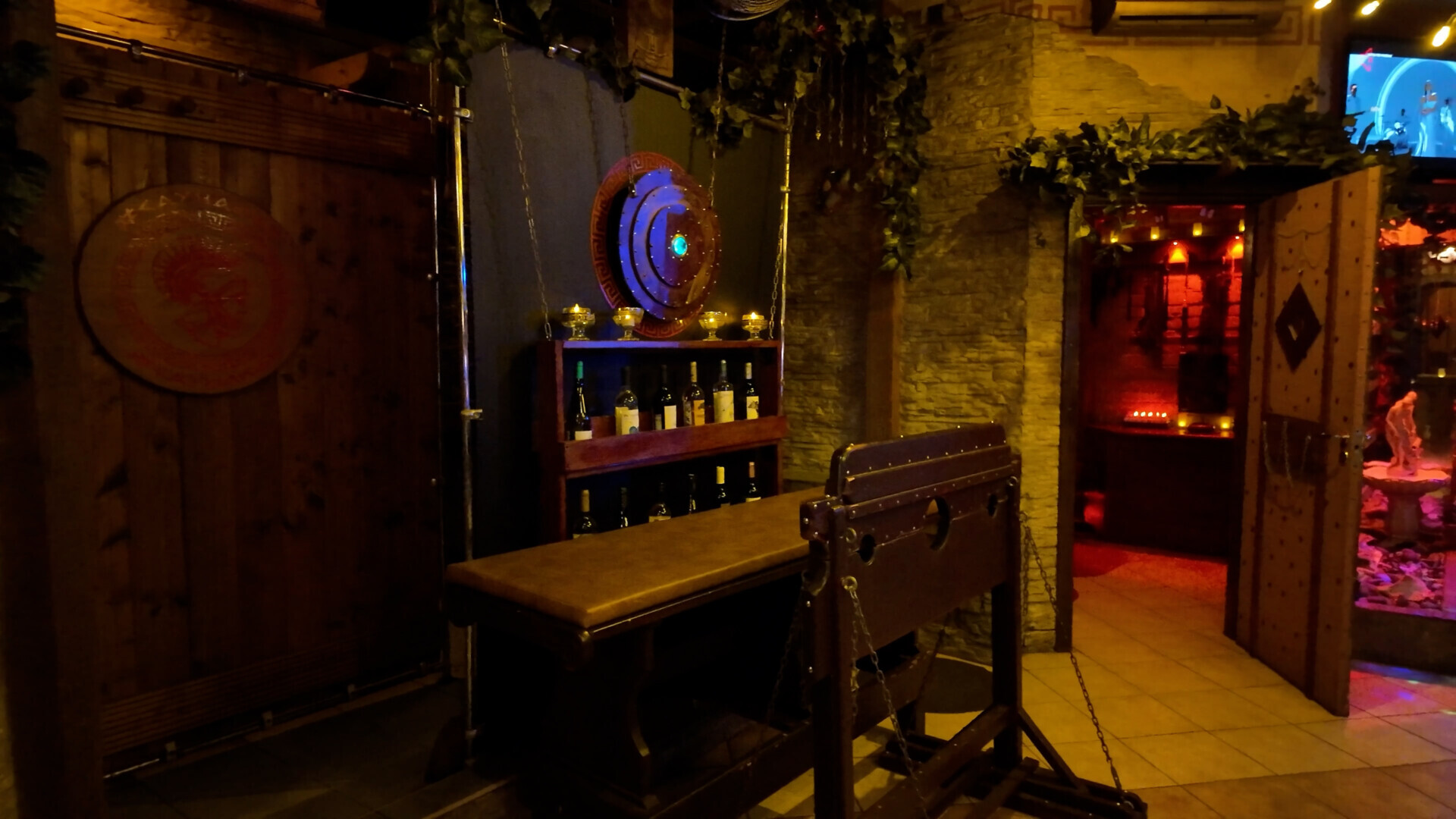 В зале стоят столы, есть зона караоке, еще один стол побольше. Из необычного — есть даже гильотина, которую, как я понял, можно использовать скорее как элемент для фотосессий. На стене висит телевизор, и там постоянно крутится фильм «300 спартанцев». Вокруг много всякой атрибутики, связанной со Спартой и античной воинской эстетикой.