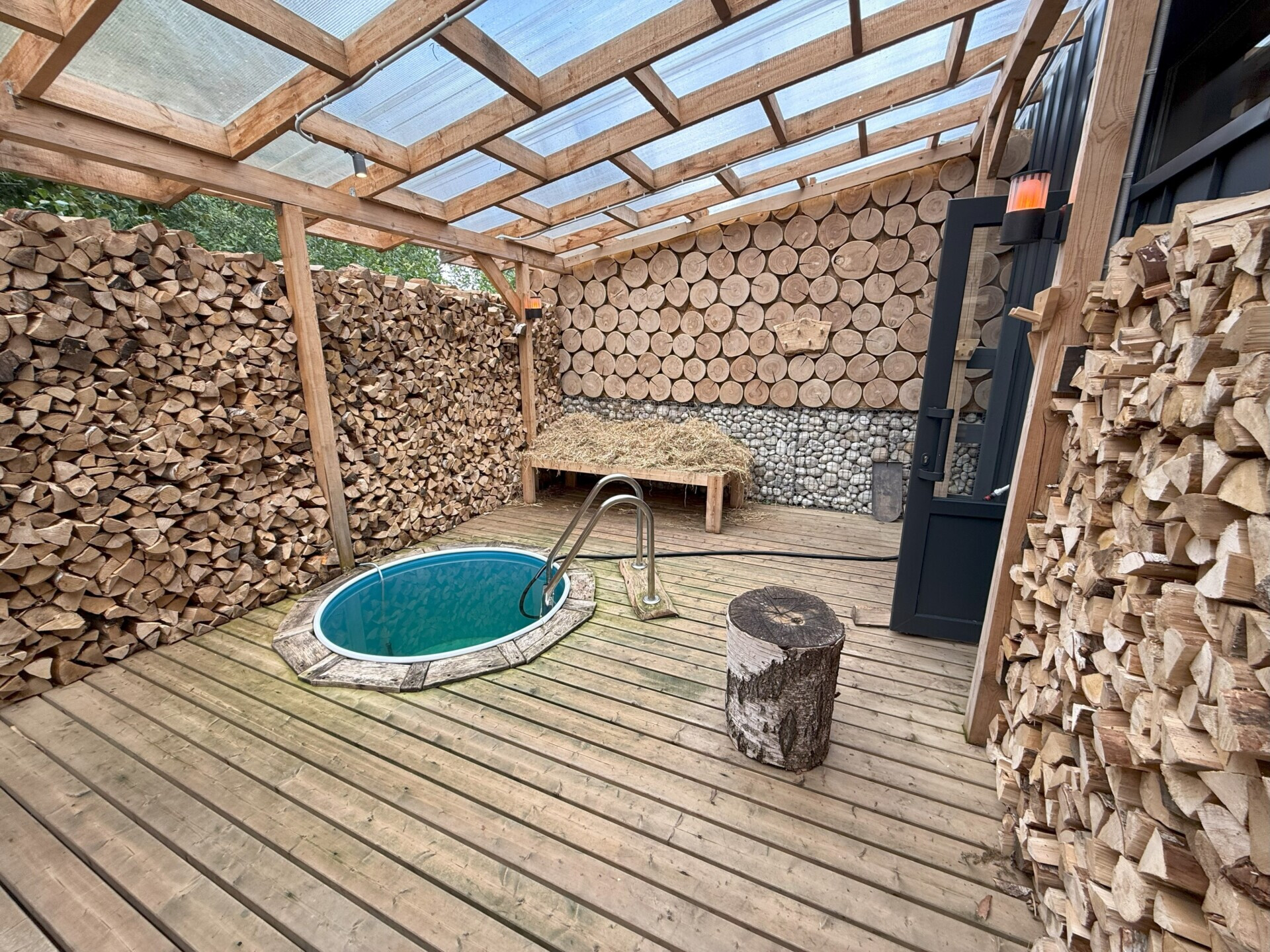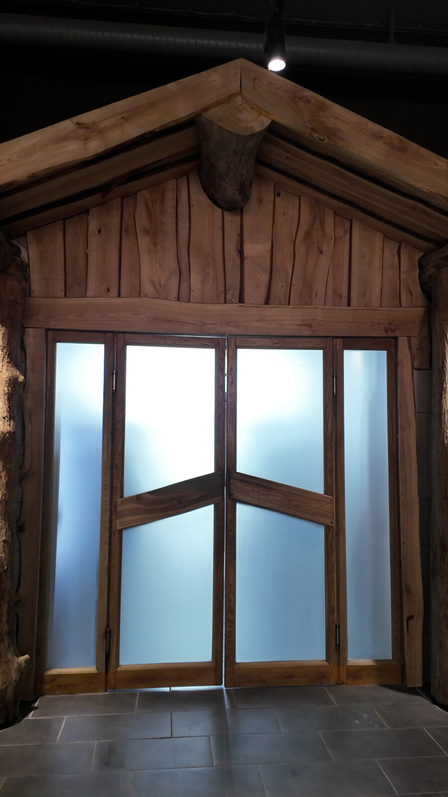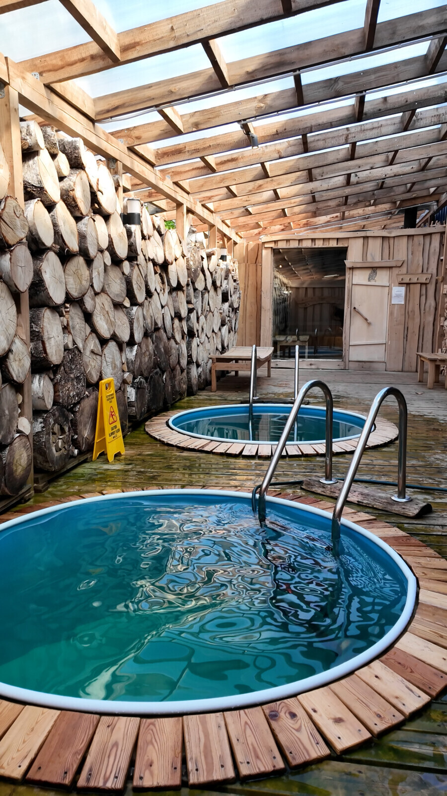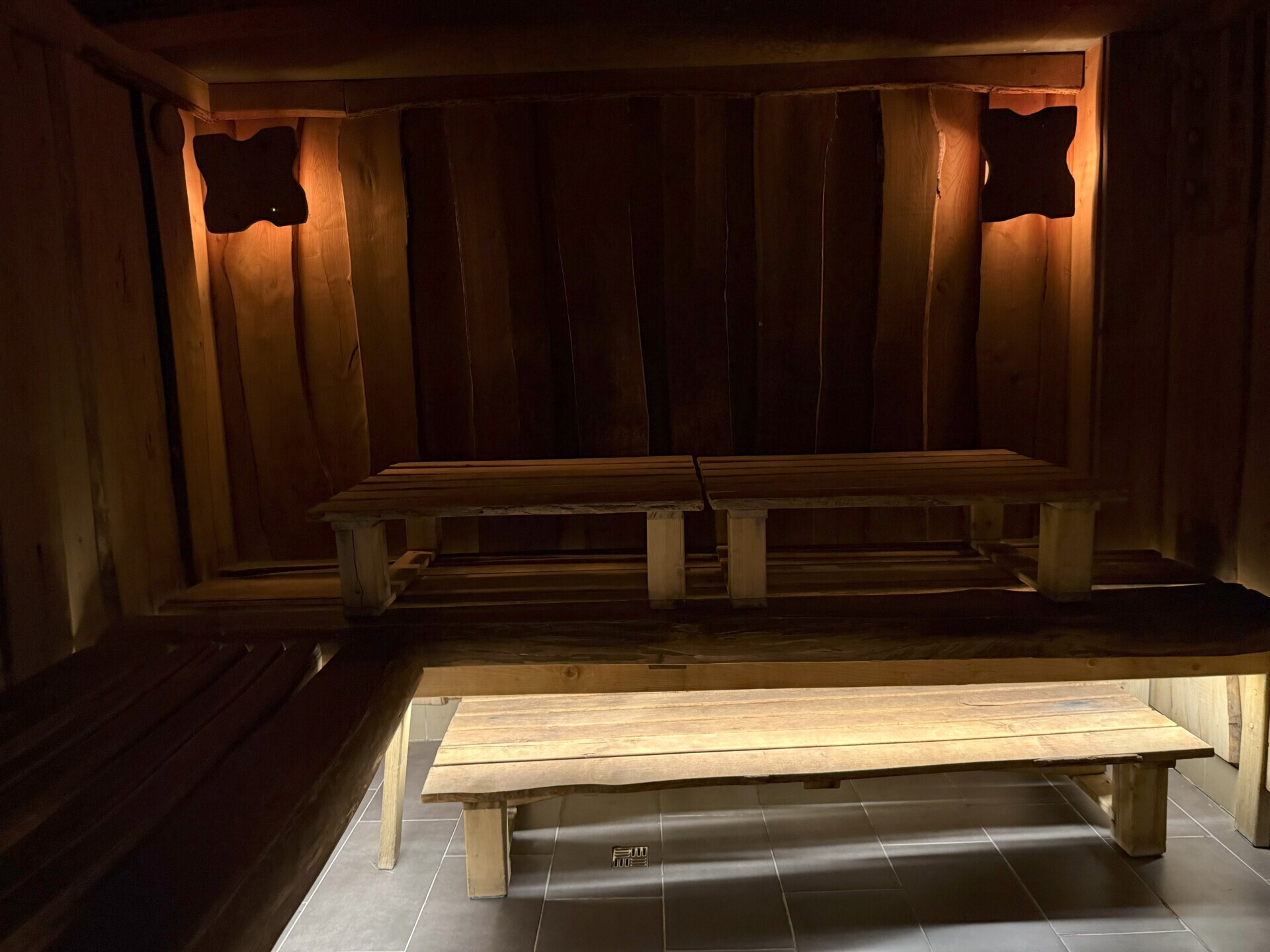 Также есть выход на террасу. На террасе расположены две ледяные купели, скамейки и зоны для отдыха. Плюс там есть еще одна небольшая парная — скорее, как мне показалось, для индивидуальных парений. По сути это такой отдельный небольшой домик на улице с панорамным остеклением и видом как раз на купели. Но именно в ней мы не парились, так что что-то конкретное про неё говорить не буду.