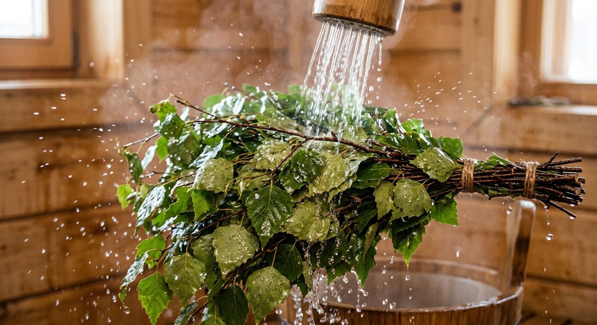Перед парением буквально на минуту держу веник над каменкой. Но важно: сначала поддаём немного воды на камни, чтобы пошёл пар.